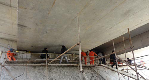 首先我司工作人員對鎮(zhèn)江路段橋梁的跨距、每跨的梁片數、梁片的結構形式以及橋梁的高度進行現場現場勘察。并查看相關圖紙核實橋梁縱向連續(xù)梁片數,從而初步計算出梁體重量及荷載能力。然后經過測量梁片與墩臺之間的實際距離,研究放置千斤頂的位置及臨時支撐位置。討論現場施工操作人員、觀察人員的位置以及整個施工環(huán)境。