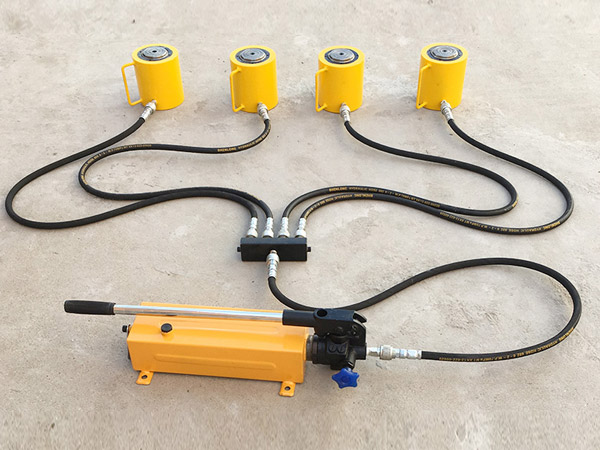 7、如需幾只千斤頂同時(shí)起重時(shí),除應(yīng)正確安放千斤頂外,應(yīng)使用多頂分流閥,且每臺(tái)千斤頂?shù)呢?fù)荷應(yīng)均衡,注意保持起升速度同步。還要考慮因重量不勻地面可能下陷的情況,防止被舉重物產(chǎn)生傾斜而發(fā)生危險(xiǎn)。